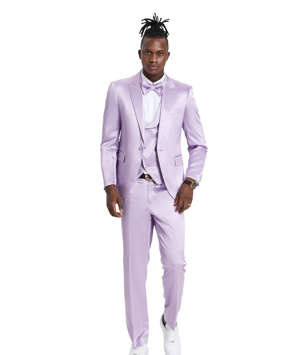 Men's Lavender Solid Shiny U-Shape Vest Suit