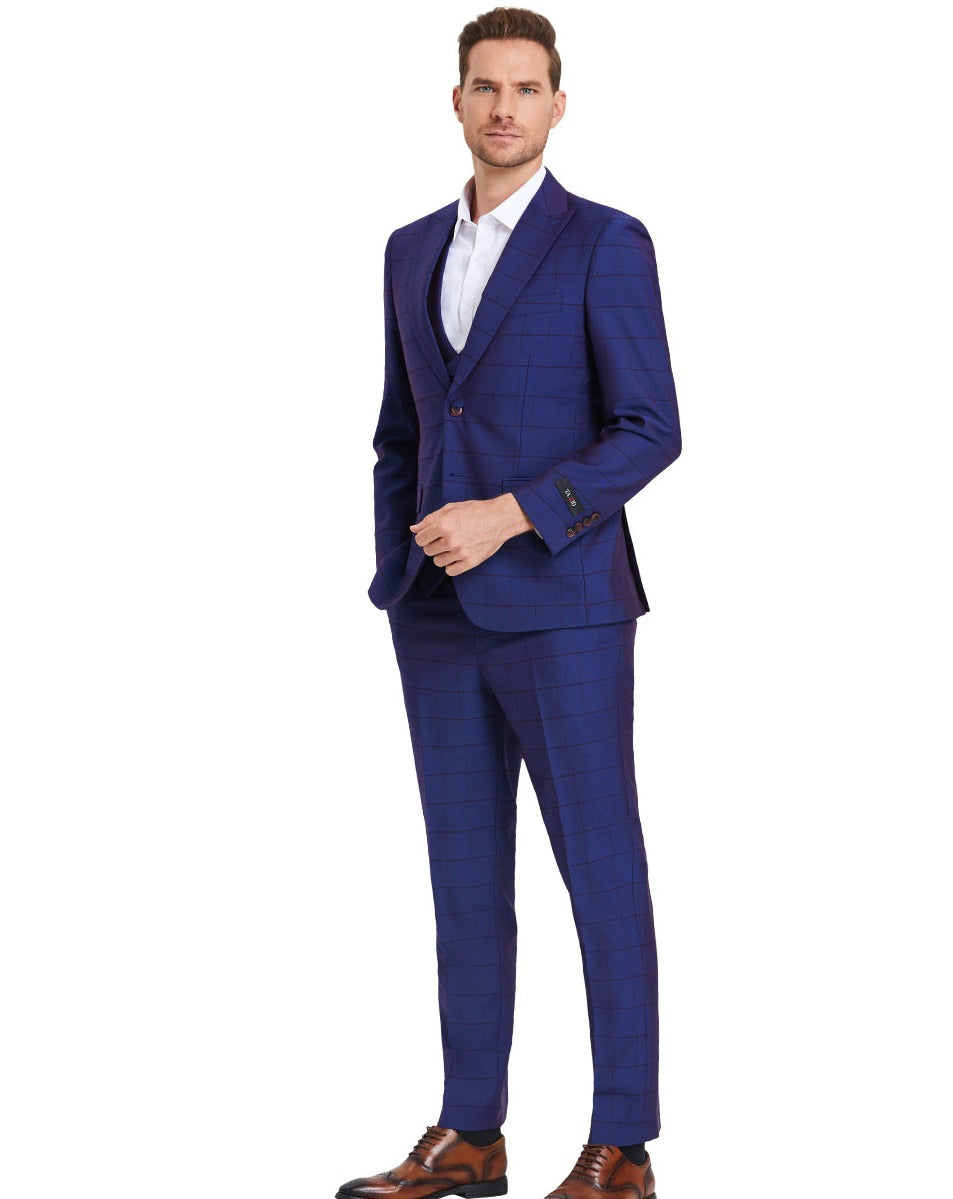 Men's Wine Window Plaid-Double Breast U-Shape Vest Suit