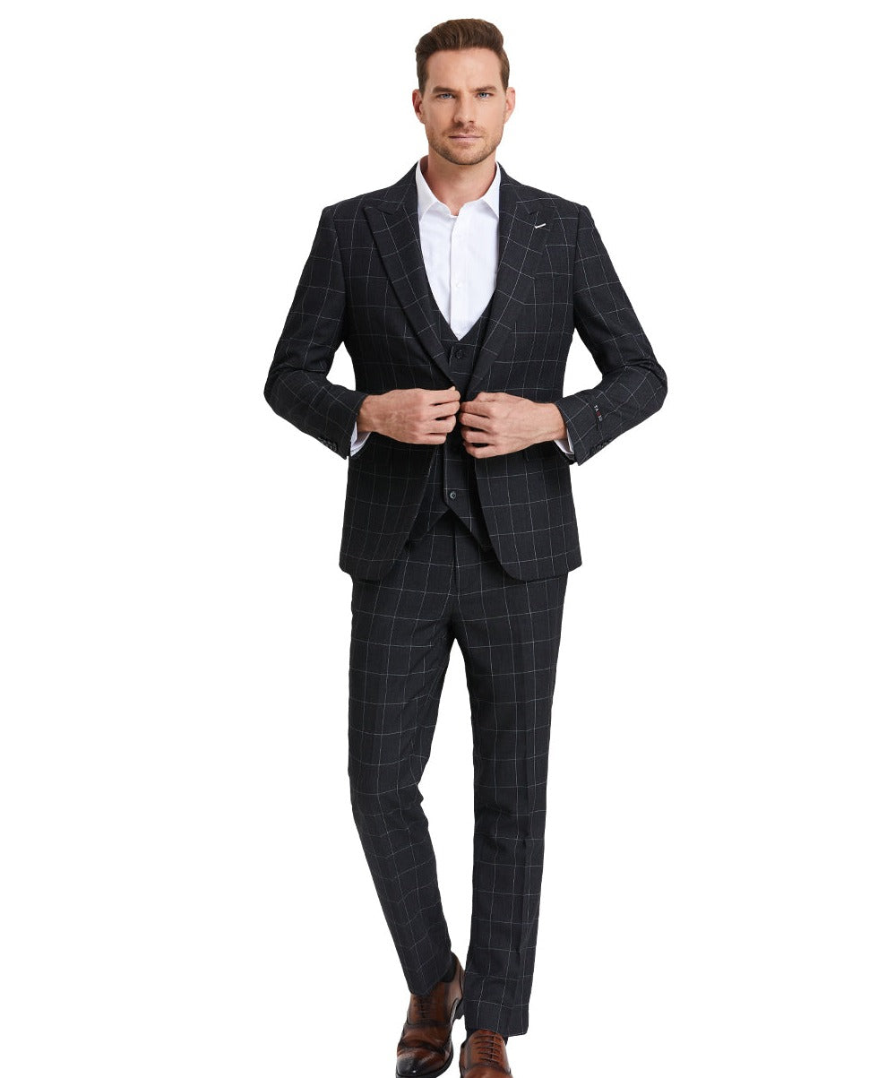Mens Black Window Plaid Double Breast U-Shape Vest Suit