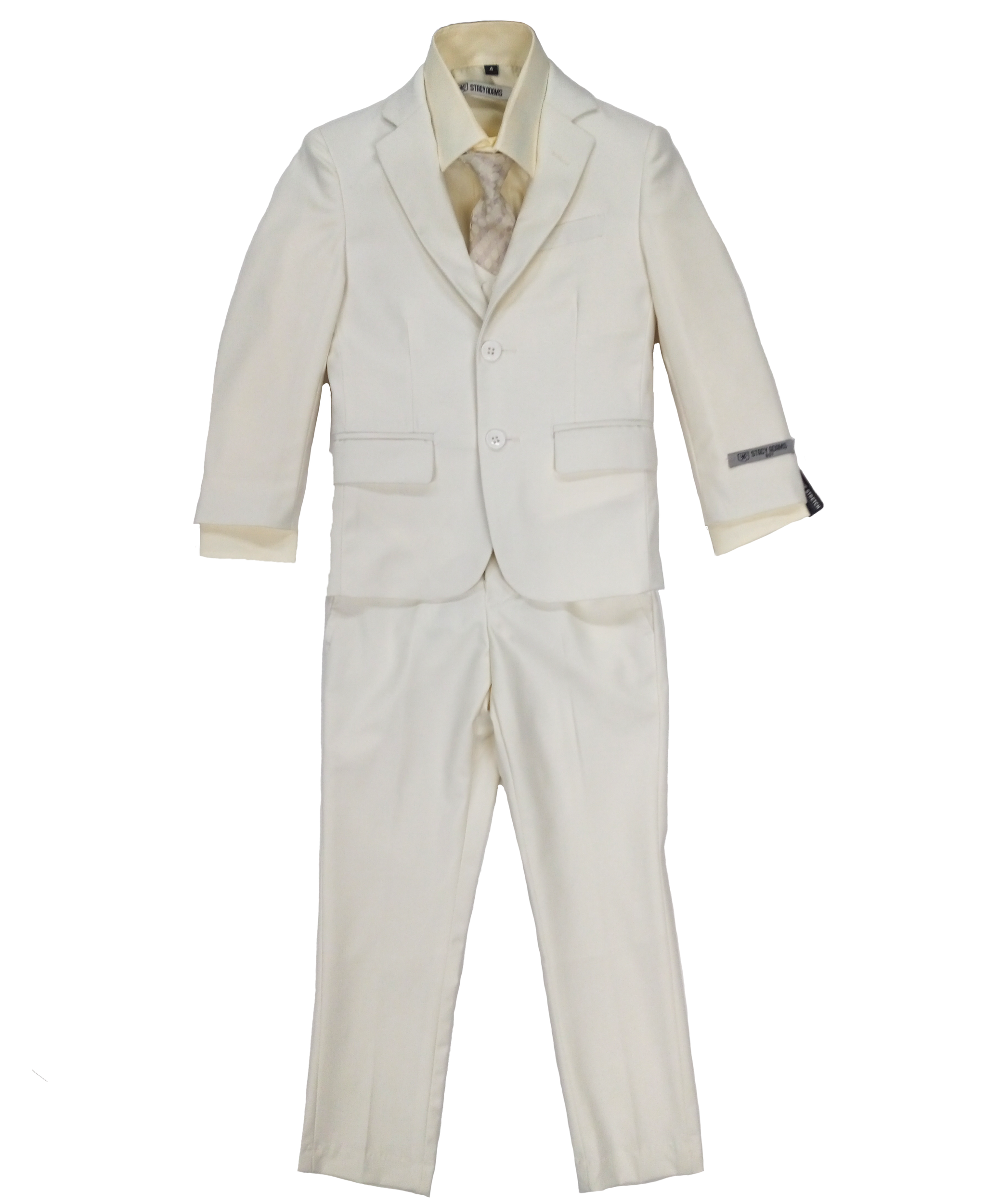 Infuse elegance into your young gentlemen's wedding ensemble with our Boys Stacy Adams Ivory 5-Piece Suits. Displaying a classic Notch Lapel and tailored Slim Fit, these suits effortlessly combine timeless charm with contemporary style. The Two Button Front Closure adds a touch of refinement, while the Solid 5-Piece design, inclusive of Flap Pockets and Interior Pic-Stitching, ensures a polished finish. Prioritizing comfort, the Elastic Adjustable Waist Band and Expandable Material guarantee seamless movement. Expertly crafted from a blend of 65% Polyester and 35% Cotton, these suits strike the perfect balance between sophistication and durability, making them an ideal choice for those cherished wedding moments.
