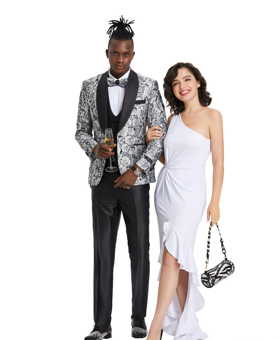 For a bold and stylish wedding look, choose our Mens Silver/Black Shawl Collar Paisley Suit in a skinny fit. The shawl collar and paisley pattern add a touch of sophistication, while the one-button front closure and two front slit pockets provide a modern touch. This 3-piece suit includes a jacket, pants, and vest, all fully lined for comfort. Perfect for grooms and groomsmen who want to make a statement on their big day. Order now and make your wedding a day to remember!