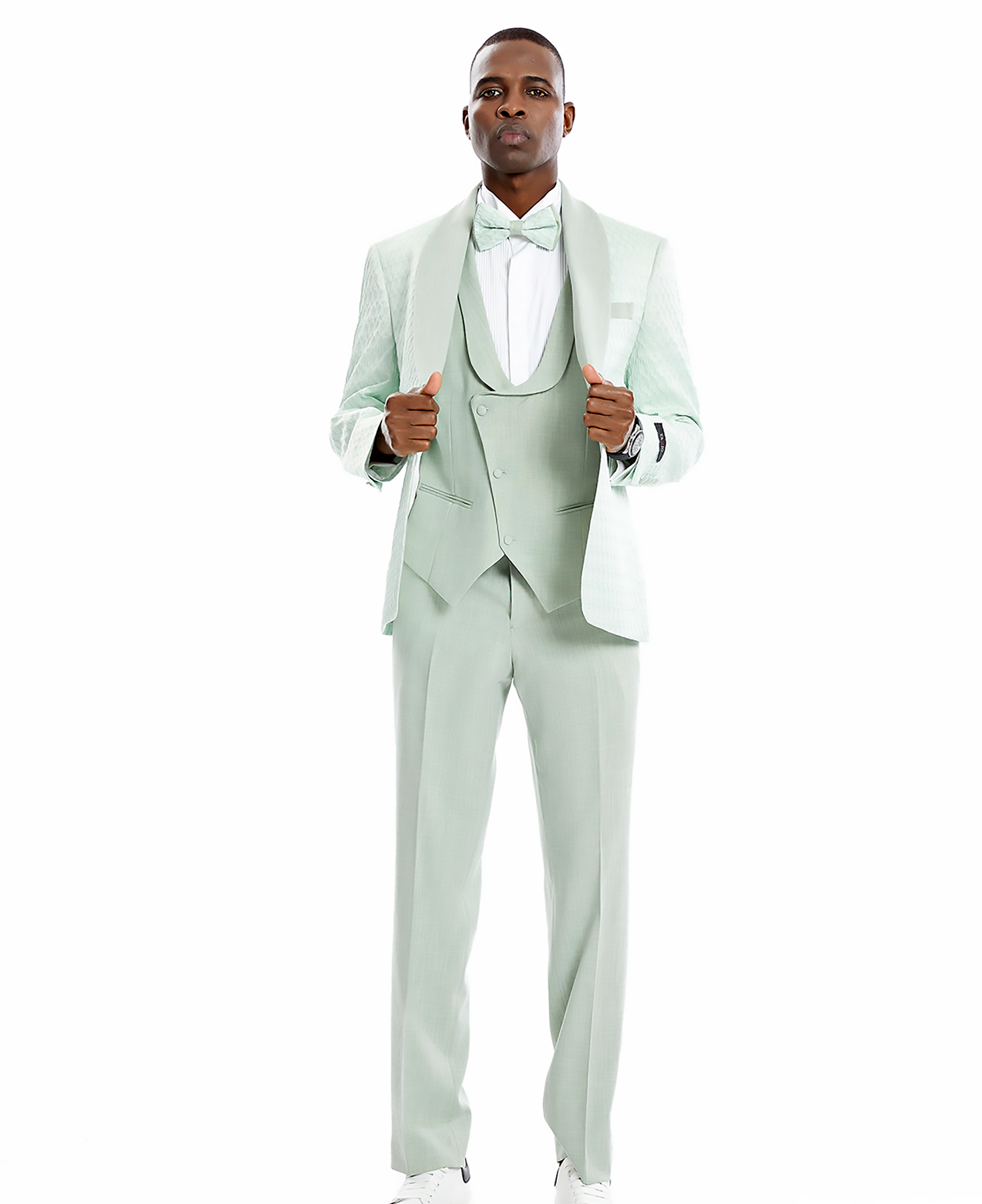 Get ready to turn heads with our sleek and stylish Men's Mint Skinny Fit Satin Shawl Collar suit. The satin shawl collar adds a touch of sophistication, while the skinny fit keeps things modern and fresh. The suit pattern features a unique and eye-catching gold paisley design that's perfect for a wedding or any special occasion. The double-breasted vest and one satin button front closure complete the elegant look. With two satin-trimmed side slit pockets and fully lined stitching, this suit is both fashionable and functional. The matching solid pants complete the ensemble for a head-to-toe look that's sure to impress. Make a statement and elevate your fashion game with this stylish suit.