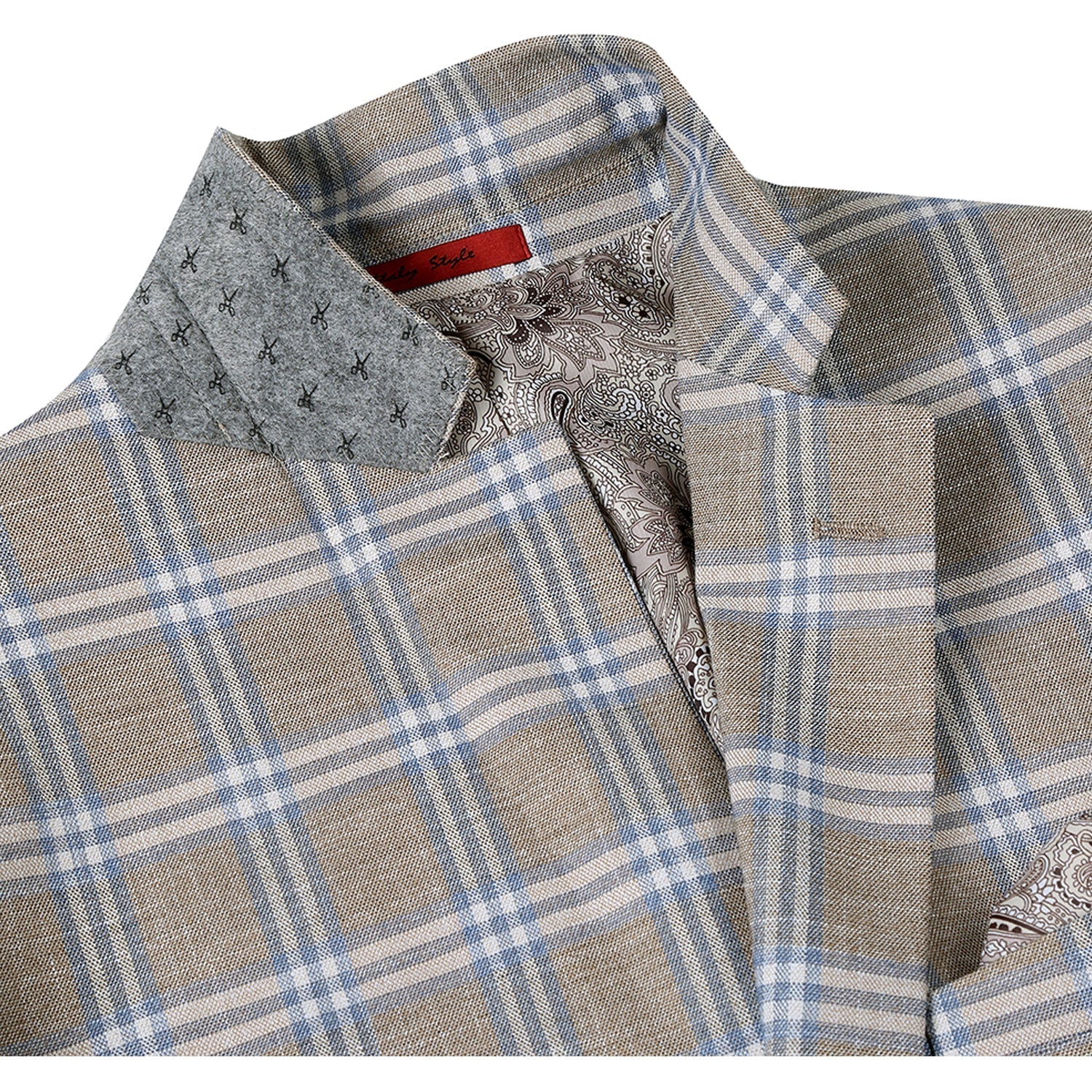 Crafted from a blend of high-quality materials, including polyester, rayon, and spandex, this blazer is both comfortable and durable. The light gray check pattern adds a touch of elegance, while the notch lapels and four-button cuffs provide a classic look.